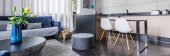 Panorama eklektycznego salonu z nowoczesnym czarnym stołem jadalnym z krzesłami, stylową kanapą, stołem kawowym i dekoracjami oraz dużą, zabytkową szafą