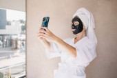 młoda Azjatka w glinianej masce, piżamie i ręczniku na głowie trzymając czerwone wino w sypialni na zamazanym pierwszym planie