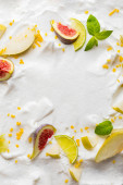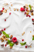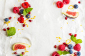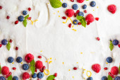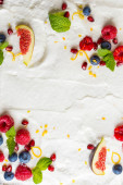 Bita śmietana z białek jaj z malinami, jagodami, granatami, figami. Kompozycja jagód z miejscem na tekst na białym tle. Układ graficzny. Widok z góry.