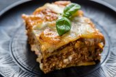 Smaczne pieczone klasyczne włoskie lasagne w zapiekance na jasnym tle. Zbliżenie