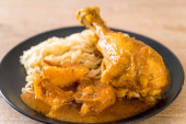 domowej roboty gulasz z kurczaka z pomidorami, cebulą, marchewką i ziemniakami na talerzu z ryżem