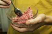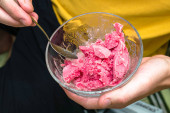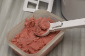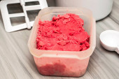 domowe lody wiśniowe w plastikowym pojemniku na stole obok łyżki do lodów i maszyny do lodów