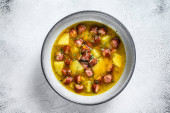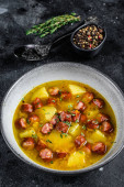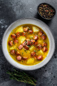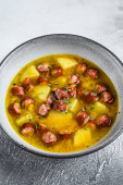 Zdjęcie "Niemiecka zupa grochowa z wędzonymi kiełbaskami. Białe tło. Widok z góry" może być wykorzystywane do celów osobistych i komercyjnych zgodnie z warunkami zakupionej licencji Royalty-free. Obraz jest dostępny do pobrania w jakości wysokiej rozdzielczości do 5760x3840.