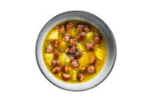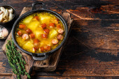 Niemiecka zupa grochowa z wędzonymi kiełbaskami. Białe tło. Widok z góry