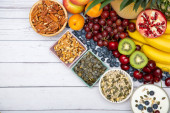 Selection of healthy foods, vegetables, fruits, almonds, salad, exercise tools and measuring tape - Top of view.