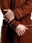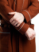 kobieta w jasnym szlafroku reklamuje szczegóły odzieży na białym tle. Zrobione w studiu z bliska.