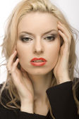 brunetka dama odpoczynku głowę w ręce na białym tle na białym tle