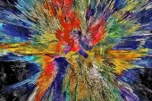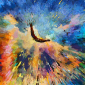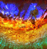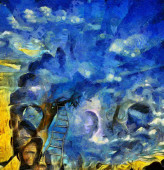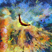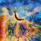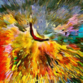 Surrealistyczny obraz. Orzeł leci w żywe chmury.