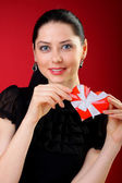 uroczy młoda dziewczyna koszty na stoisko i uśmiechów na białym tle
