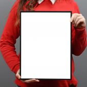 młody biznes dziewczynka wygląda na pokładzie reklamy, które ma kontrolę nad na białym tle