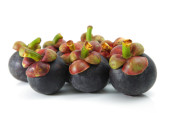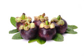 Mangosteen izolowany na białym tle. Mangosteen (Garcinia mangostana), znany również jako fioletowy. Słynne egzotyczne owoce z Tajlandii