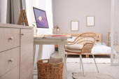 Drewniany stół z lampą biurkową w pokoju. Projekt wnętrza