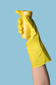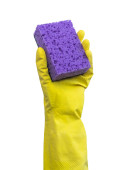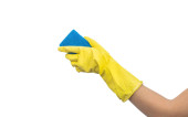Ręka w żółtej gumowej rękawicy z gąbką czyszczącą izolowaną na jasnym tle, zdjęcie koncepcji sprzątania kuchni