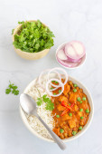 Weganie tajski żółty curry z kalafiorem ozdobiony Cilantro i Lemon Top Down zdjęcie na białym tle
