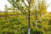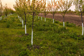 Piękne światła zachodu słońca nad sadem drzew z malowanymi pniami w bieli.