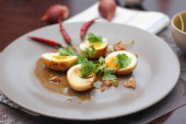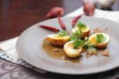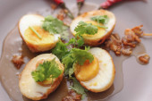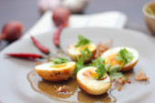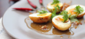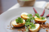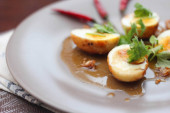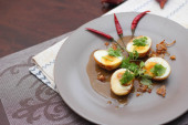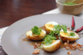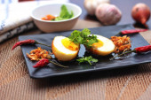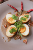 Jajko z sosem Tamarind w białym talerzu serwowane na drewnianym stole z kolendrą posypkę, jest popularnym lokalnym daniem, które ludzie tajskie jeść.