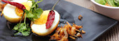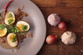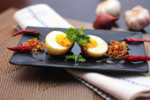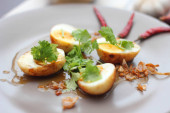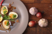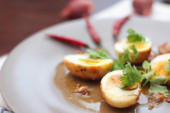 Jajko z sosem Tamarind w białym talerzu serwowane na drewnianym stole z kolendrą posypkę, jest popularnym lokalnym daniem, które ludzie tajskie jeść.