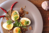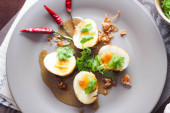 Jajko z sosem Tamarind w białym talerzu serwowane na drewnianym stole z kolendrą posypkę, jest popularnym lokalnym daniem, które ludzie tajskie jeść.