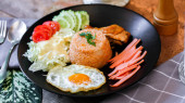 Jajko z sosem Tamarind w białym talerzu serwowane na drewnianym stole z kolendrą posypkę, jest popularnym lokalnym daniem, które ludzie tajskie jeść.