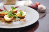 Jajko z sosem Tamarind w białym talerzu serwowane na drewnianym stole z kolendrą posypkę, jest popularnym lokalnym daniem, które ludzie tajskie jeść.