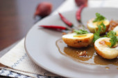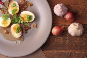 Jajko z sosem Tamarind w białym talerzu serwowane na drewnianym stole z kolendrą posypkę, jest popularnym lokalnym daniem, które ludzie tajskie jeść.