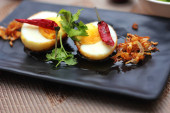 Jajko z sosem Tamarind w białym talerzu serwowane na drewnianym stole z kolendrą posypkę, jest popularnym lokalnym daniem, które ludzie tajskie jeść.