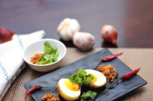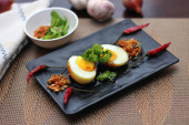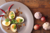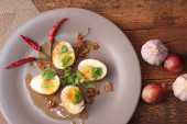 Jajko z sosem Tamarind w białym talerzu serwowane na drewnianym stole z kolendrą posypkę, jest popularnym lokalnym daniem, które ludzie tajskie jeść.