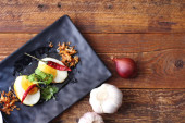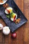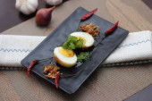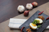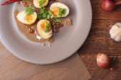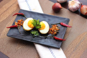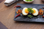 Jajko z sosem Tamarind w białym talerzu serwowane na drewnianym stole z kolendrą posypkę, jest popularnym lokalnym daniem, które ludzie tajskie jeść.