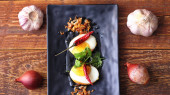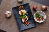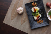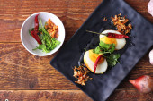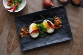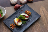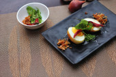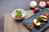 Jajko z sosem Tamarind w białym talerzu serwowane na drewnianym stole z kolendrą posypkę, jest popularnym lokalnym daniem, które ludzie tajskie jeść.