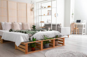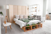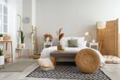 Zdjęcie "Wnętrze stylowego pokoju z wygodnym łóżkiem" może być wykorzystywane do celów osobistych i komercyjnych zgodnie z warunkami zakupionej licencji Royalty-free. Obraz jest dostępny do pobrania w jakości wysokiej rozdzielczości do 5760x3840.