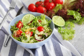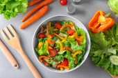 Miska pysznej sałatki z warzywami i serem feta na drewnianym stole