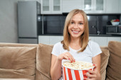 Szczęśliwy uśmiech kobieta spoczywa na kanapie i jeść chrupiące karmelowy popcorn podczas oglądania telewizji w domu