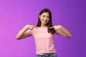 Zdjęcie "Close-up szczery beztroski azjatycki brunetka śmieje się głośno, cieszyć się film komedia, zabawy, żarty przyjaciół, stoisko rozrywka fioletowy tle rozbawiony, wyrazić pozytywne emocje" może być wykorzystywane do celów osobistych i komercyjnych zgodnie z warunkami zakupionej licencji Royalty-free. Obraz jest dostępny do pobrania w jakości wysokiej rozdzielczości do 5760x3840.