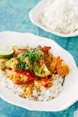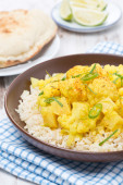 Tajski wegańskie curry warzywne na białym tle, Culiflower Curry z ryżem w płycie zdjęcie pionowe