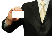 człowiek w apartament i czerwone krawat trzymając się zwykły biały wizytówki dla Ciebie do podjęcia