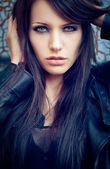 piękna kobieta portret na sobie skórzaną kurtkę w pobliżu ścian