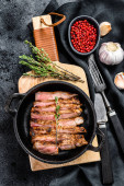 Grillowane picanha organiczne steki wołowe na patelni z ziołami i czosnkiem. Nad starym ciemnym tłem metallu, widok z góry z miejscem na tekst