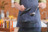Zdjęcie "Kobieta z garnkiem smacznej zupy w kuchni" może być wykorzystywane do celów osobistych i komercyjnych zgodnie z warunkami zakupionej licencji Royalty-free. Obraz jest dostępny do pobrania w jakości wysokiej rozdzielczości do 5760x3840.