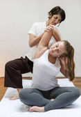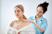 Masażystka poruszająca ciężarnymi kobietami plecy i ramiona zapewniające masaż w salonie spa