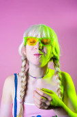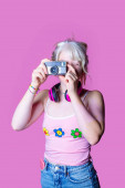 Izolowana biała młoda kobieta korzystająca ze smartfona i słuchawek słuchających muzyki lub oglądających wideo surfing w sieci - przycięty baner reklamowy