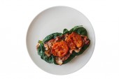Pietruszka pomidorowa i sałatka z kopru na białym talerzu na ciemnym tle. Zdrowe jedzenie na odchudzanie, wegetariańskie jedzenie. Świeże warzywa pokrojone w talerz na czarnym tle.