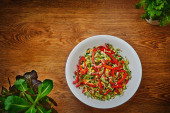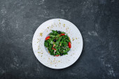 Zdjęcie "Pietruszka pomidorowa i sałatka z kopru na białym talerzu na ciemnym tle. Zdrowe jedzenie na odchudzanie, wegetariańskie jedzenie. Świeże warzywa pokrojone w talerz na czarnym tle." może być wykorzystywane do celów osobistych i komercyjnych zgodnie z warunkami zakupionej licencji Royalty-free. Obraz jest dostępny do pobrania w jakości wysokiej rozdzielczości do 5760x3840.
