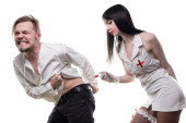 Wampir kobieta z otwarte usta, szykując się do ugryźć człowieka. na białym tle na tle czystego. Więcej moich zdjęć wysokiej rozdzielczości halloween tematu.