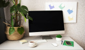 Biurowy biurko. Laptop z wyposażeniem biurowym na stole.
