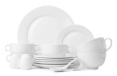 Zestaw z różnymi czystymi naczyniami na białym tle