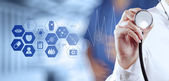 ręka lekarza medycyny pracy z komputerem nowoczesny interfejs