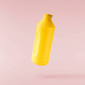 Środki czystości dla gospodarstw domowych. Plastikowa butelka spadająca w powietrze