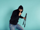 Zdjęcie "Złodziej z kominiarką działa w ciszy, kradnąc mieszkania z nożycami do drutu w ręku" może być wykorzystywane do celów osobistych i komercyjnych zgodnie z warunkami zakupionej licencji Royalty-free. Obraz jest dostępny do pobrania w jakości wysokiej rozdzielczości do 5760x3840.
