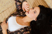 obraz relaksujący piękna młoda kobieta brunetka dziewczynka leżąc na białe łóżko w piżamie szczęśliwy uśmiechający się, patrząc na kamery portret