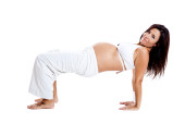 piękna kobieta w ciąży na białym korzystających z tego wspaniałego momentu